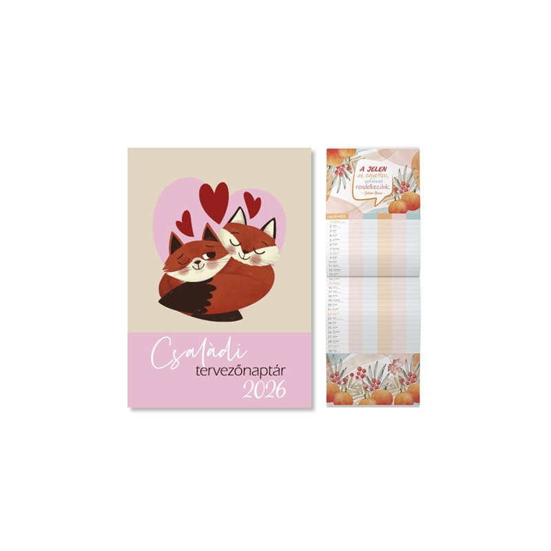 A pd Családi tervező 2026 falinaptár rendezett keretet ad a közös programok, határidők és fontos események követéséhez. A 21 × 30 cm-es álló formátum kihajtva 21 × 60 cm-es, jól olvasható felületet biztosít, a 4+4 színes nyomás és az irkafűzött, lyukasztott kivitel pedig tartós, esztétikus megjelenést nyújt egész évben.